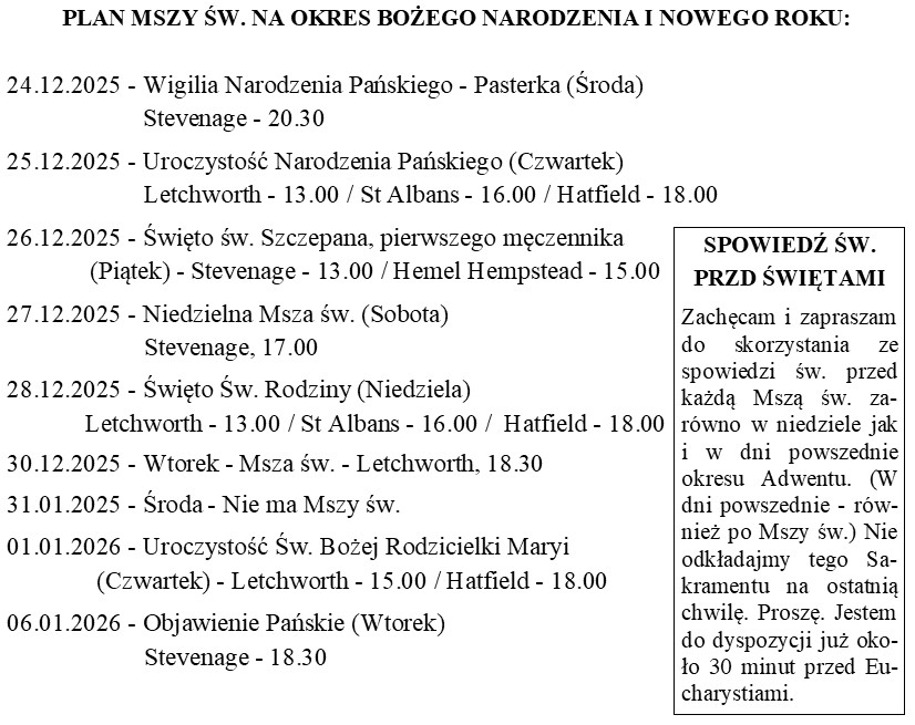 7. 0d 06 stycznia 2026 r. do końca miesiąca stycznia 2026 nie będzie Mszy św. wtorkowych w Letchworth.